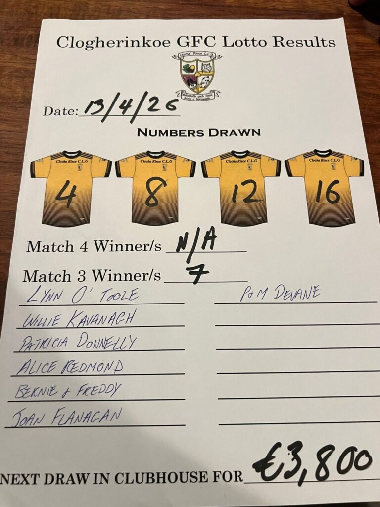 The numbers drawn in our Lotto draw on April 13th were 4, 8, 12 & 16. There was no Jackpot winners and 7 match three winners. Congratulations to Lynn O’ Toole, Willie Kavanagh, Patricia Donnelly, Alice Redmond, Bernie & Freddy, Joan Flanagan and P&M Devine.
