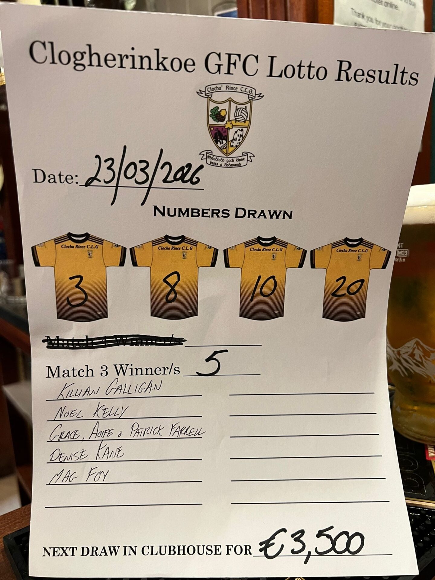 The numbers drawn in our Lotto draw on March 23rd were 3, 8, 10 & 20. There was no Jackpot winners and 5 match three winner. Congratulations to Killian Galligan, Grace, Aoife & Patrick Farrell, Noel Kelly, Denise Kane and Mag Foy.